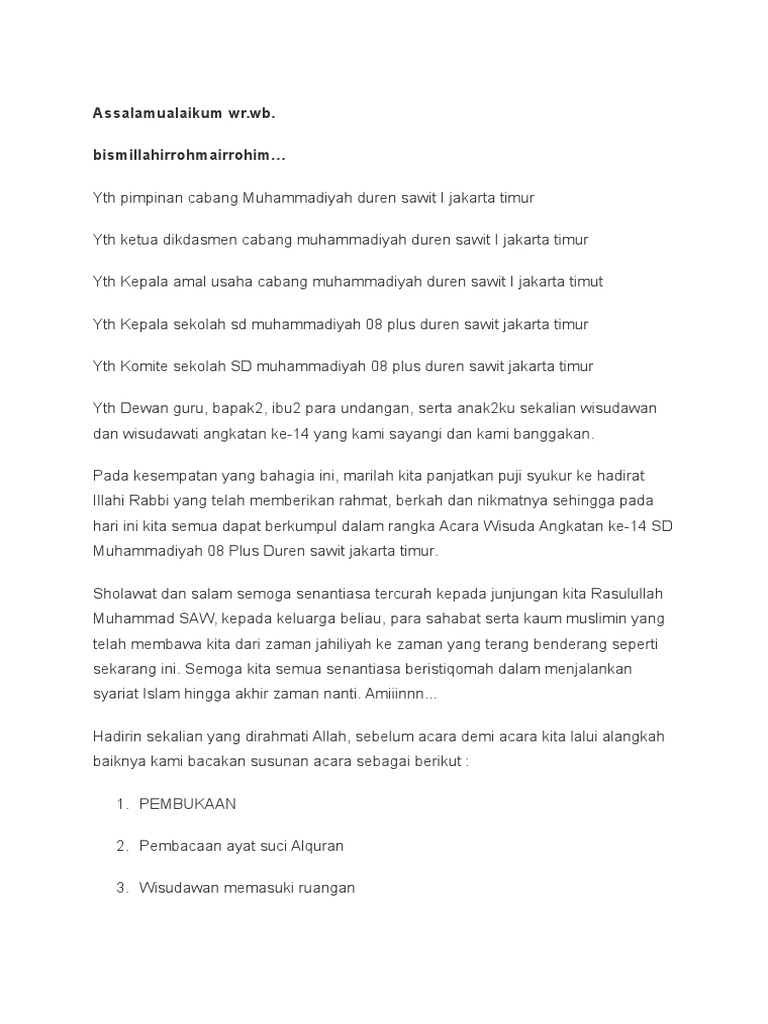 Ini pertama-tama marilah kita senantiasa memanjatkan puji syukur kehadirat Allah SWT karena kita masih diberikan kesempatan dan kesehatan sehingga kita masih bisa mengahadiri acara pelepasan siswa kelas 6 SD. Susunan Acara Perpisahan Kelas 6 SDN Sekarjati 1 Karanganyar Lengkap Sebelum acara pada pagi hari ini kita mulai marilah kita buka dengan bacaan ummul kitab semoga acara pada pagi hari ini dapat berjalan lancar tiada halangan suatu apapun. Contoh Teks MC Pembawa Acara Santunan Anak Yatim Piatu.