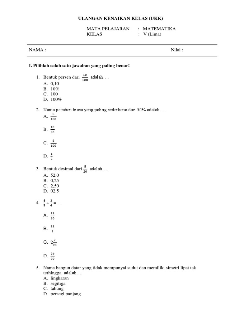 Soal Ukk Matematika Kelas 5 Semester 2 Asli 1