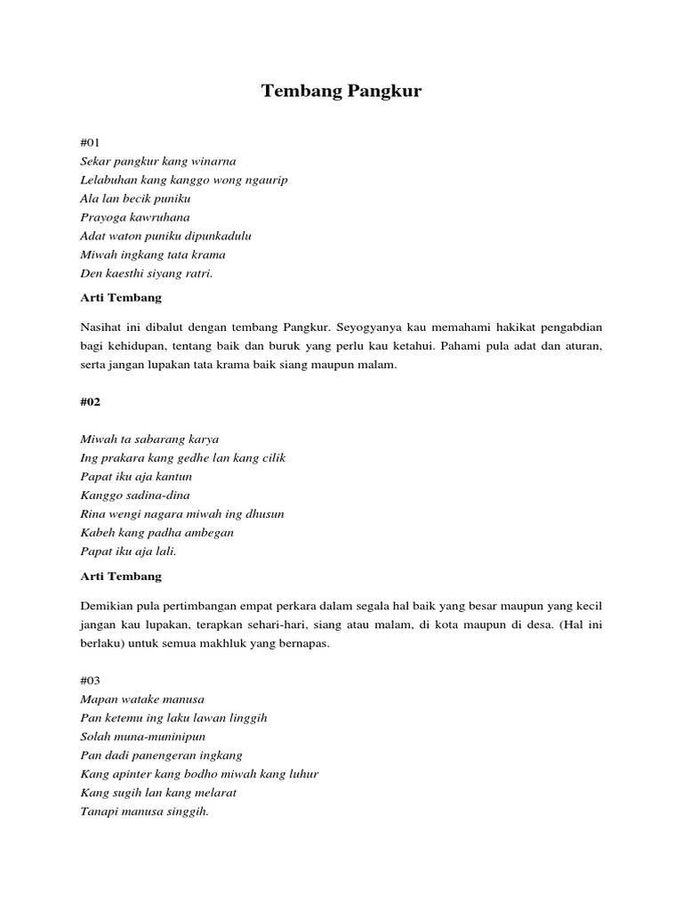 Nalika paprangan negara Manggada bisa mboyong putri dhomas diaturake marang ratu 3. Ing ngisor iki kang dudu watake tembang pangkur yaiku. Macapat merupakan sebutan bagi puisi Jawa yang membahas tentang kehidupan manusia.