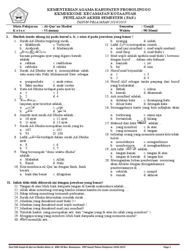 Soal essay qur'an hadits kelas 7 semester 1. Kisi kisi soal uas qur an hadits kelas vii viii ix semester 1 lengkapnya kisi kisi soal uas qur an hadits kelas 7 8 9 semester 1 tahun pelajaran 2018 2019 yang anda butuhkan saat ini guna sebagai bahan acuan untuk menghadapi soal pas al qur an hadits mts 2018. Soal PAT Semester Genap Akidah Akhlak Kelas 7 MTs. Atau d untuk jawaban yang benar.
