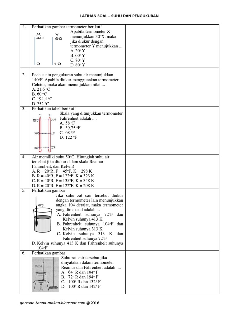 VIISemester I Topik. Berikut adalah contoh latihan soal fisika untuk kelas 7 pada semester 1 dengan materi suhu dan pemuaian ada 15 soal pilihan ganda dengan pembahasannya ala saya hehehe dalam pembahasan soal ada tips tips untuk menguasai fisika pada materi suhu dan pemuaian. Adapun satuan suhu lainnya adalah derajar Reamur derajat Celcius dan derajat Fahrenheit.
